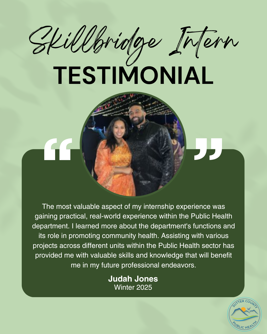 The Sutter County Public Health Internship Program offers students and emerging professionals a unique opportunity to gain hands-on experience in the dynamic field of public health. Designed to support the development of future public health leaders, our program provides meaningful, real-world exposure to public health practices, policies, and community engagement.